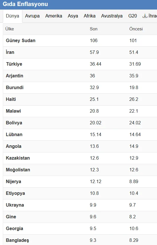 Paylaşılan tabloya göre Türkiye, %36,44’lük gıda enflasyonu oranıyla; iç savaş ve büyük ekonomik buhranlar yaşayan Güney Sudan (%106) ve ağır yaptırımlar altındaki İran’ın (%57,9) hemen arkasında yer alarak dünya üçüncüsü oldu.